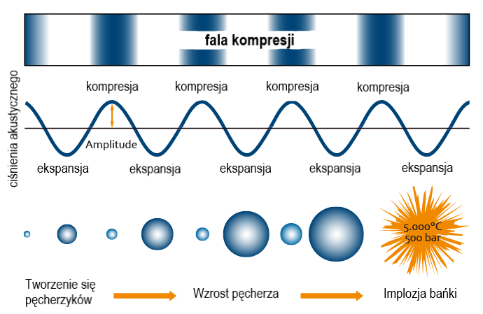 Ultradźwięk o wysokiej intensywności prowadzi do rozerwania wiązań w cząsteczkach wody w fazie podciśnienia,